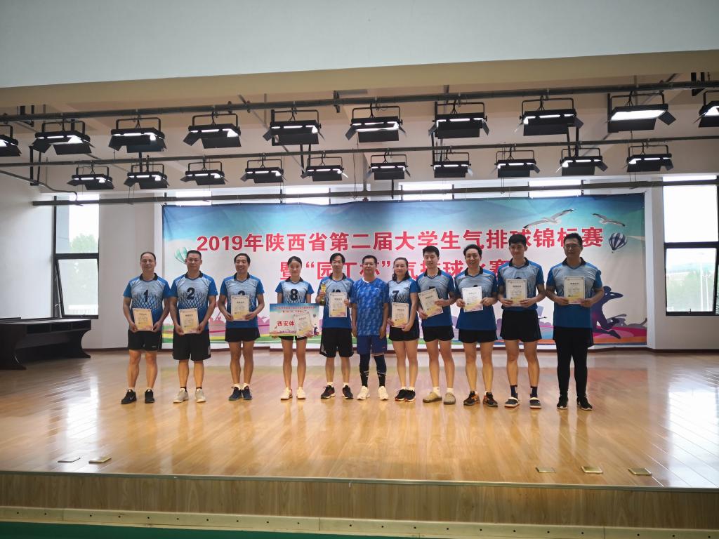 在第一阶段小组赛中,我院职工气排球代表队分别战胜西工大明德学院、西北大学、西北政法大学代表队,以小组第一的成绩进入第二阶段的淘汰赛。在第二阶段比赛中,分别战胜省教委代表队和西北大学代表队进入决赛。决赛中与东道主西安财经大学争夺冠亚军,最终以21:8、21:14的比分力压对手获得冠军。