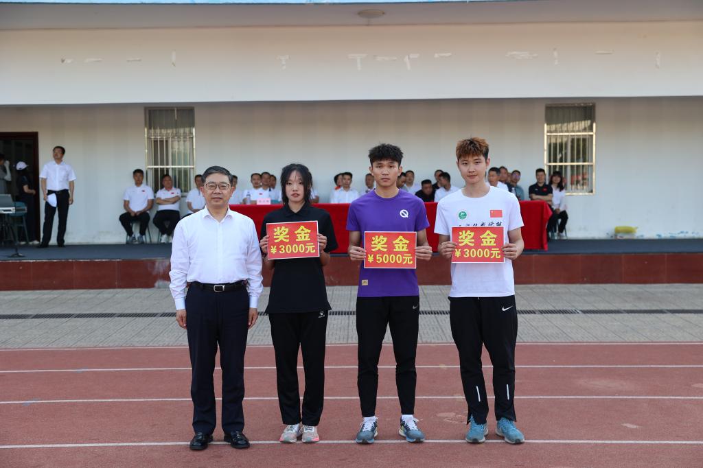 (刘子实为打破校记录的学生代表颁发奖金)