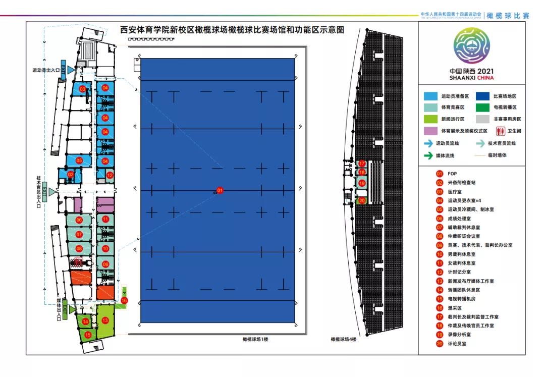 第十四届全运会橄榄球赛场位于西安体育学院鄠邑校区,是“一馆四场”中占地面积最大的场馆设施,主赛场总座位数5088个,地上两层,总高18.35m,拥有可同时接待八支运动队的运动员更衣室八间,场馆功能设施先进,夜间照明条件良好,具备承接国际国内大型橄榄球赛事的优越条件。