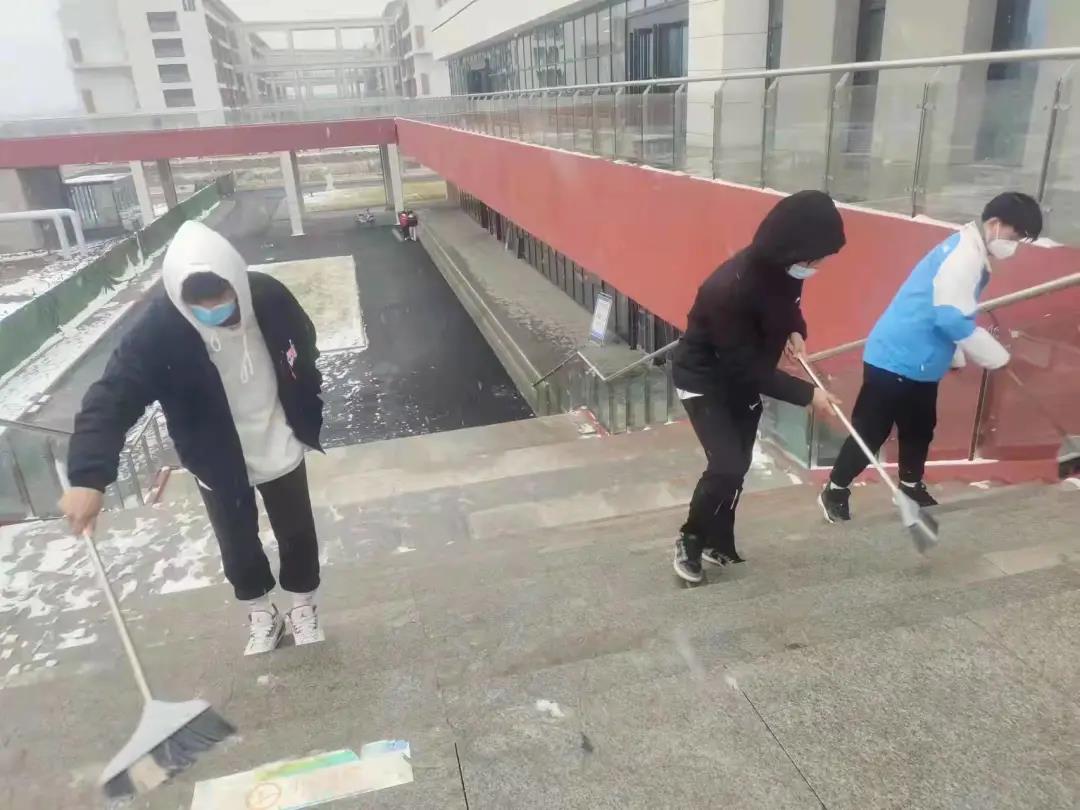 运动休闲学院成立了防疫志愿者队伍,组织同学到食堂等各公共场所清理积雪,为校区师生提供了安全干净的生活场所。
