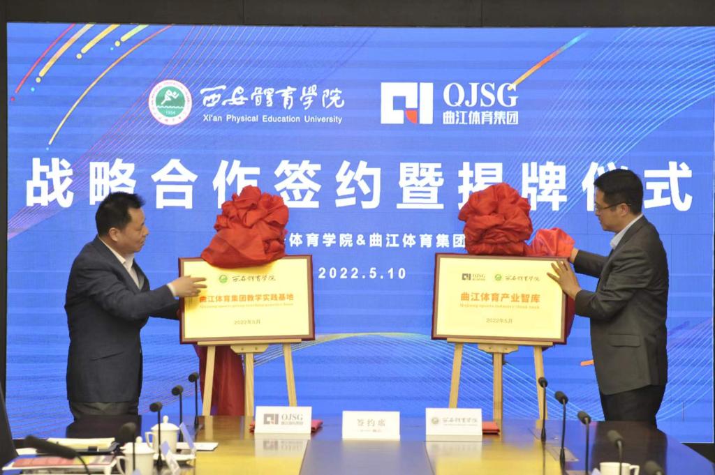 签约仪式上,学校副校长张卫国与曲江体育集团董事长葛超共同为“曲江体育集团教学实践基地”和“曲江体育产业智库”揭牌。双方将汇聚各领域专家学者通过人才智库的建设,推动高校体育学术成果转化运用,推动体育专业智库与产业前沿的有机结合,实现体育高水平人才培养通道的有效贯通。