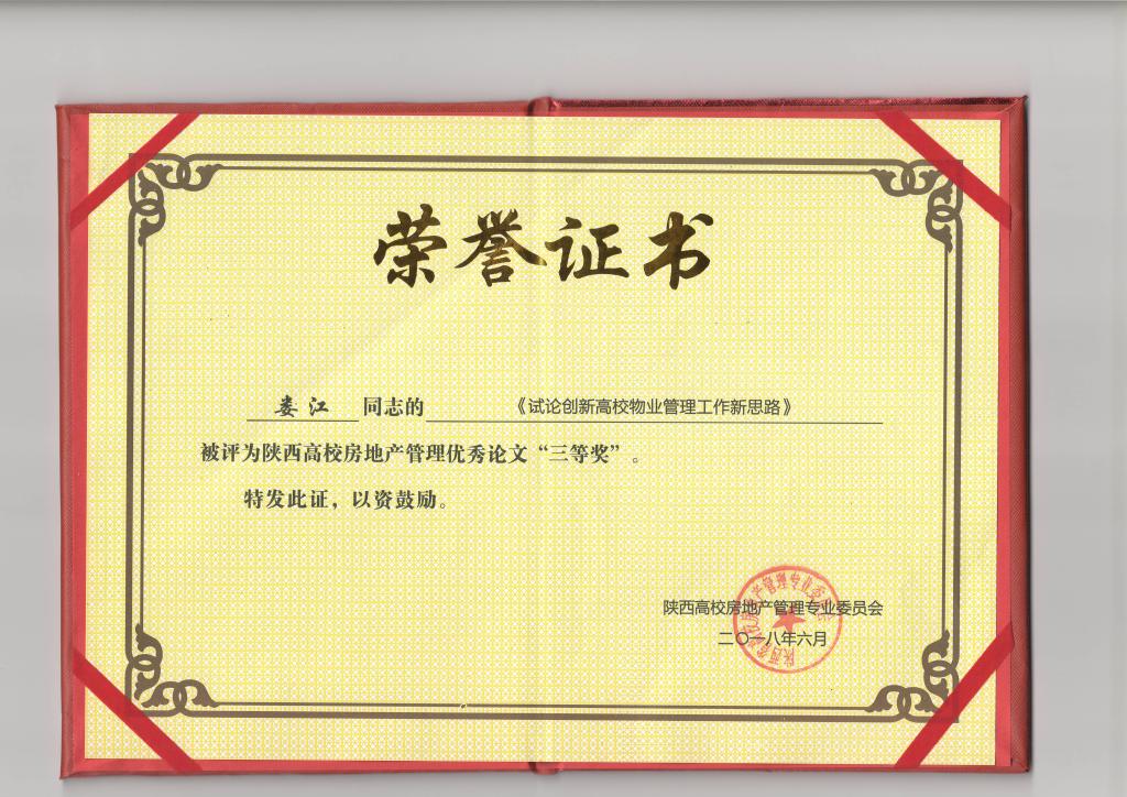 本网讯 6月20日——22日,陕西省高校房地产管理专业委员会2018年年会在宝鸡召开。会议围绕高校房地产关注的热点及难点问题,邀请相关部门领导与专家就有关住房改革与保障的最新政策为参会高校进行了解读。与会高校代表就新校区教工住房建设、房产管理信息化、青年教师周转房管理、老旧房屋改造等热点问题进行了讨论和经验交流。 本次会议对2017——2018年度工作成绩突出的高校房地产管理部门和个人进行了表彰,我院被评为高校房地产管理“先进集体”;国有资产管理处房产科宫贵楠同志被评为陕西省高校房地产管理工作“先进个人”;娄江同志撰写的论文《试论创新高校物业管理工作新思路》荣获陕西省高校房地产管理优秀论文“三等奖”。