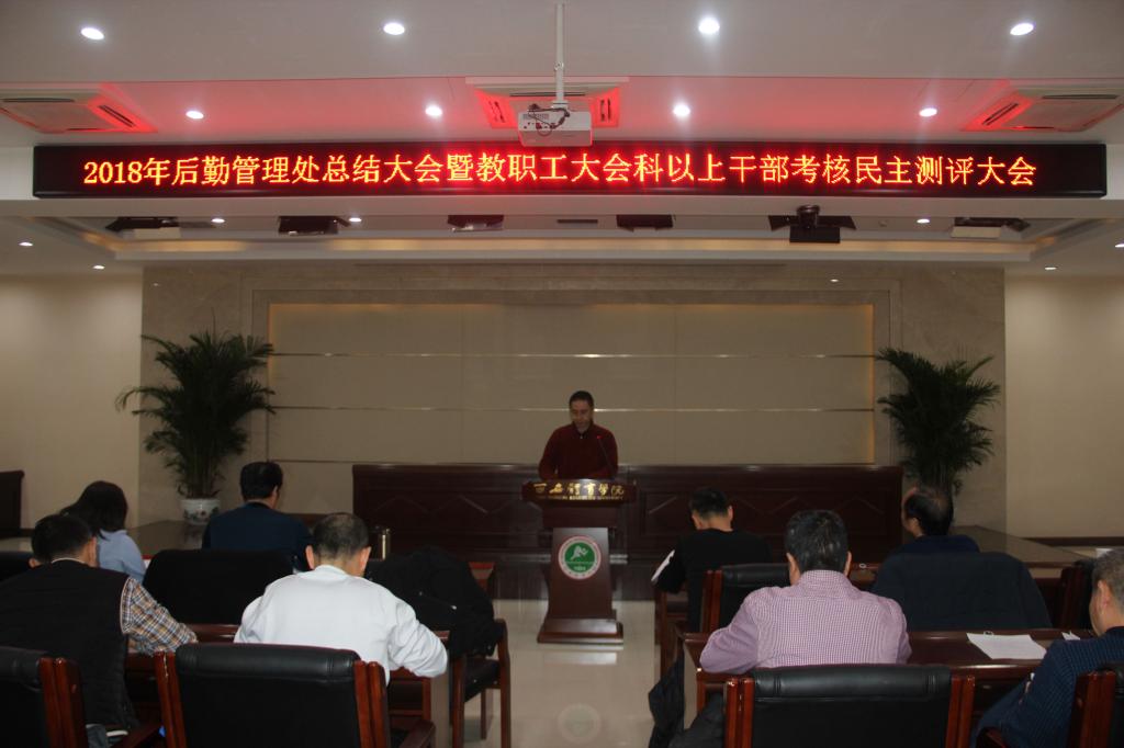 2019年1月8日上午10:15,后勤管理处在2号行政楼6楼报告厅召开2018年后勤管理处总结大会、教职工大会、科以上干部年终总结考核民主测评大会、二级教代会,后勤管理处全体干部职工参加会议,大会由后勤管理处党总支书记宋国权同志主持。
