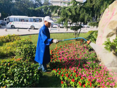 (四)校园美化工,为校庆草绿花红。保洁绿化中心加大了对校园环境卫生的清理力度,对全校区花坛景观、暑期补植的月季、杜鹃等花卉精心浇灌,对草坪、绿植进行修整造型,对校园各处进行清扫,对工程建筑遗留垃圾冲洗清运,对垃圾箱、宣传栏清理擦拭,在校门口、办公楼等处张挂灯笼及彩旗,渲染校庆氛围。