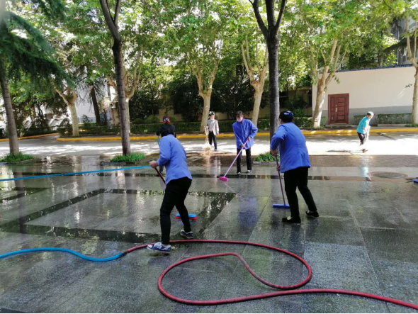 (一)后勤管理处(集团)保洁绿化中心在对工作人员进行体温检测、登记后,严格按照校医院要求做好我校校园环境、教室清洁、通风、消毒工作。