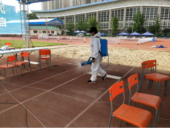 考试用卫生间(田径场、综合馆1层、篮球场)消杀4次;