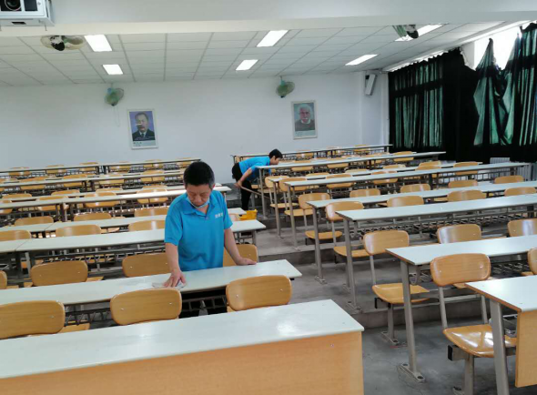 (一)后勤管理处(集团)保洁绿化中心在对工作人员进行体温检测、登记后,严格按照校医院要求做好我校校园环境、教室清洁、通风、消毒工作。