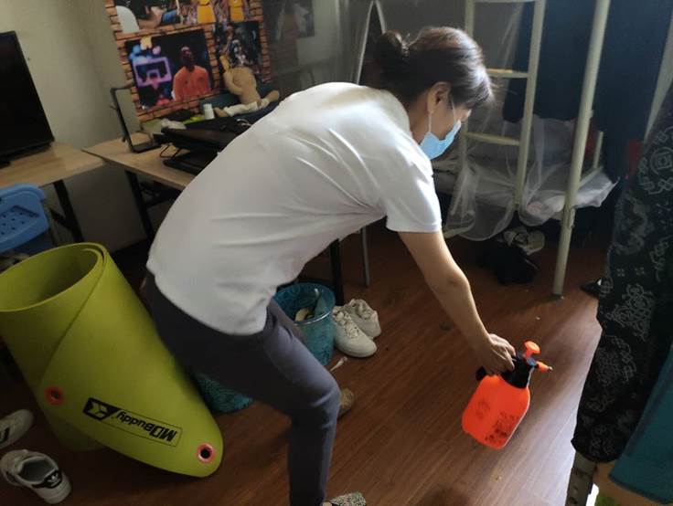 (一)后勤管理处(集团)学生公寓管理中心在对工作人员进行体温检测、登记后,严格按照校医院《学生公寓消毒指南》要求做好学生公寓清洁、消毒每日2次,通风工作每日3次,每次30分钟,以及学生体温检测工作。