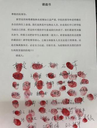 疫情阻碍了你我的脚步,却也明亮了你我共产党人的心灵。网络上一声声寄语铿锵有力,作为后勤兵的我们,完全遵照组织的殷切嘱托,在各公寓开始实施封闭式管理后,我们第一时间签订抗疫请战书,保证所有员工在此次疫情中成为能干事,干实事,真干事,干好事,同时也有敏锐的政治性和无私奉献、不怕艰难的精神和担当。