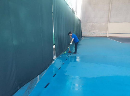 网球馆侧墙雨水漫灌进场馆,现场清扫雨水情况。