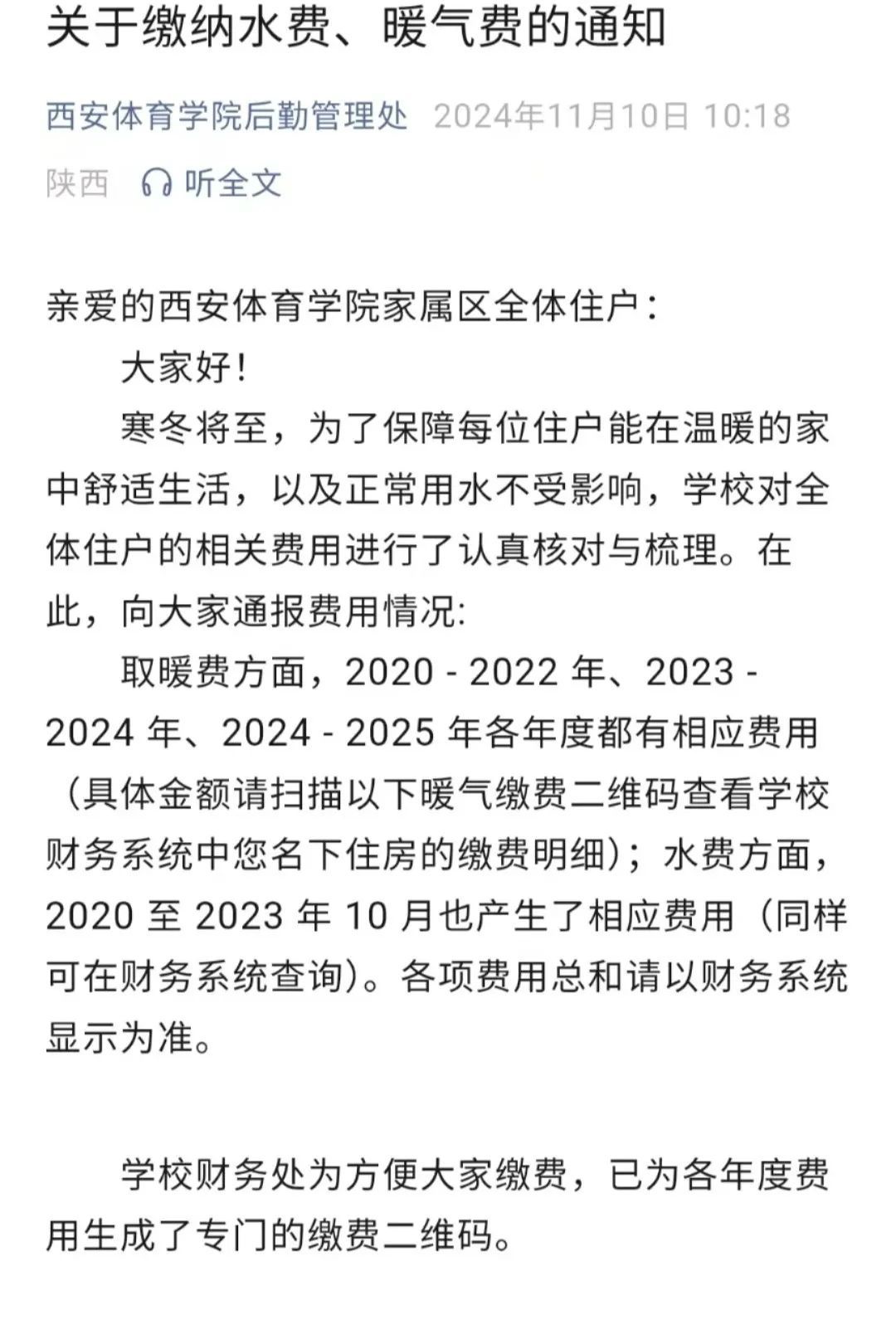 随着冬季供暖季的到来,后勤管理处各中心在主要领导的带领下,积极行动,采取多项措施,全力保障职工以及家属冬季供暖,并全面推进欠费催缴工作,确保学校权益和家属区住户能够温暖过冬。 精心筹备,夯实基础 自10月23日至11月3日,后勤管理处根据财务处提供的欠费名单,与老干处、国资处紧密合作,更新欠费户主的房产信息和联系方式,并编辑确定了催缴通知,为后续工作打下坚实基础。 创新宣传,提高效率 11月4日至10日,后勤管理处创新宣传方式,通过公众号专用催缴通知,利用疫情防控期间建立的各单元信息员群、退休职工群进行信息推送,并在单元门口、公告栏张贴纸质缴费通知,多渠道提高催缴效率。 包干催缴,精准施策 11月11日至30日,对于未缴费住户,后勤管理处实行全处干部包干催缴制度,随时与财务处沟通,确保包干住户的缴费情况得到及时跟进。 入户催缴,不留死角 12月1日至20日,后勤管理处对前期催缴未交的住户进行入户催缴,对于无法联系的住户及年纪较长行动不便的住户,积极寻找联系方式、主动协助缴费,确保催缴工作不留死角。 清缴钉子户,维护权益 12月20日至31日,后勤管理处将全面清缴钉子户,处领导、动力中心、保卫处将协律师函入户清缴,维护学校和住户的合法权益。 梳理总结,优化方案 在催缴工作的同时,后勤管理处不断梳理和总结缴费解决方案,包括与电费缴纳捆绑式解决住户一体化缴纳费用方案。与供电局、热力公司、水务集团商议解决按户自助缴费事宜、建立关于水费的入户查抄和缴费制度,以及厘清房产面积不一致问题,确保住户能够及时、准确缴纳费用。 此项工作王鑫处长深入一线工作,带领各中心干部以及一线工作人员秉持“一家人,一条心,一股劲,一起干”的理念贯彻一系列措施,旨在提高缴费效率,确保冬季供暖和供水的稳定,同时也为住户提供了更加便捷、透明的缴费服务。坚持“安全第一守底线,温暖师生筑防线;依靠大家求发展,保障服务求高线。”的工作信念,将继续努力,与住户携手共创温馨、和谐的居住环境。