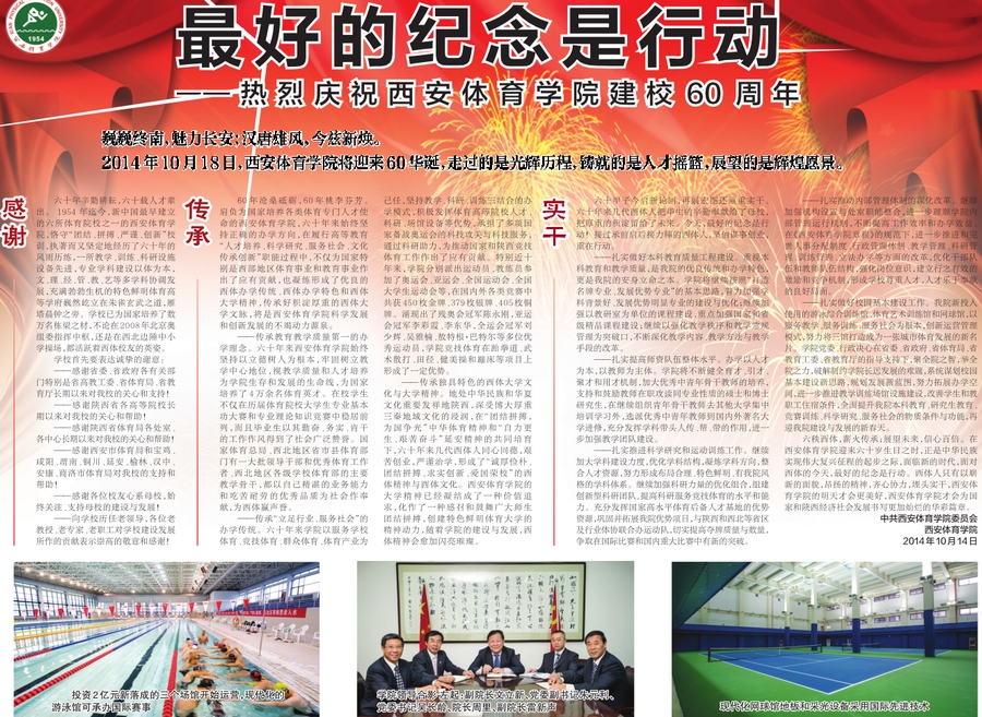 2014年10月18日,西安体育学院将迎来60周年华诞,走过的是光辉历程,铸就的是人才摇篮,展望的是辉煌愿景。