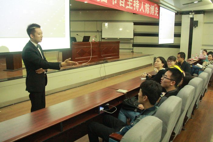 讲座中,陈博以绘声绘色的朗诵为大家现场示范了不同语调表现出的语意差异,他幽默、诙谐的表演引来阵阵掌声。陈博还为同学们介绍了朗诵与配音方面的知识,并通过对罗京、邱岳峰、孙悦斌等几位大师作品的赏析,让现场观众领略了语言艺术的魅力所在。接下来,他将艺术和青春两大话题融合,与同学们分享了自己的求学生涯、主持经历、生活感悟,鼓励同学们为自己的梦想努力,用奋斗留住青春的美好。
