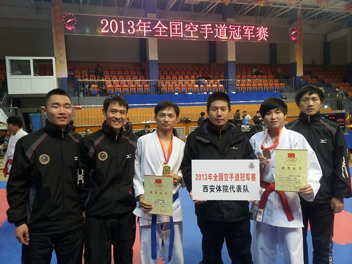 我院派出了由武术系主任马文国为领队,重竞技教研室马波副教授为主教练的5名队员参加角逐。最终获得1金1铜的优异成绩,其中体育经济与体育管理系2010级学生路璐(下图左三)获得金牌。这是我院空手道队乃至西北地区空手道项目在全国顶级赛事中获得的首枚金牌。