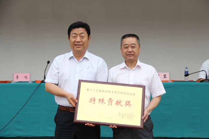 陕西省政府教育督导团总督学曹普选(左六)、周里副院长为获得“道德风尚奖”代表队颁奖