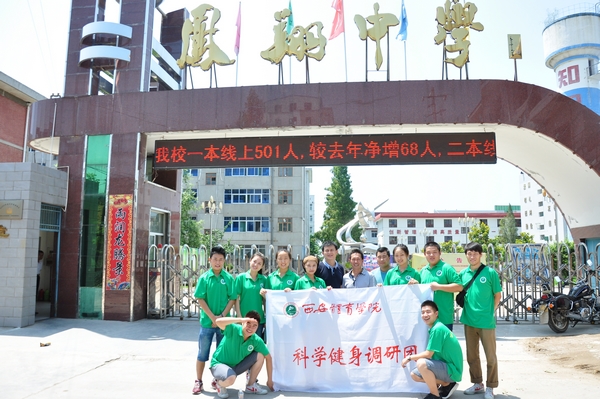 调研团首先来到有着70多年历史的西府名校凤翔中学宣传和普及科学健身知识,并在这里建立“西安体育学院大学生社会实践基地”。挂牌仪式上,调研团还代表我院向凤翔中学和凤翔县东关逸夫小学分别赠送了一批体育器材。调研团的队员们还为凤翔中学部分教师进行了体质测试,并结合测试结果有针对性地进行一对一的健身指导,发放了科学健身手册,受到热烈欢迎和广泛好评。