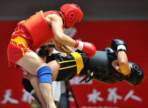 本网讯“五大连池杯”2012全国男子武术散打锦标赛于5月31日—6月6日在黑龙江省黑河市举行。在最后一天的比赛中,我院散打名将敖特根·巴特尔(左,红方)75公斤级决赛中,以2比0战胜对手,夺得冠军。