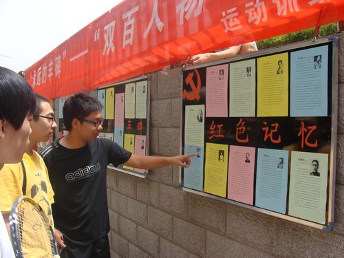 为庆祝中国共产党建党九十周年,使我院师生接受一次爱国主义和革命历史教育,运动训练系2009级党支部从5月17日起在研究生教育中心楼前设立展板,推出4期“双百”英雄模范人物和“感动中国”人物事迹展。展出期间,路过展板的老师和同学纷纷驻足观看,认真学习英雄模范和感动中国人物事迹。活动受到学院师生的广泛好评。