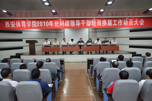 党委副书记朱元利和党委副书记、纪委书记苏义民在会上分别宣读了《中共西安体育学院委员会关于2010年学院处科级领导干部轮岗换届工作的实施意见》(西体党发【2010】19号)、《关于二○一○年干部轮岗换届首批正处级干部确定岗位的通知》(西体党发〔2010〕23号)两份文件,向与会代表传达了轮岗换届工作的指导思想、工作原则、组织领导、工作程序以及时间安排,并宣布了经2010年5月6日院党委会议研究决定的陈彦等25位同志的岗位任职情况。