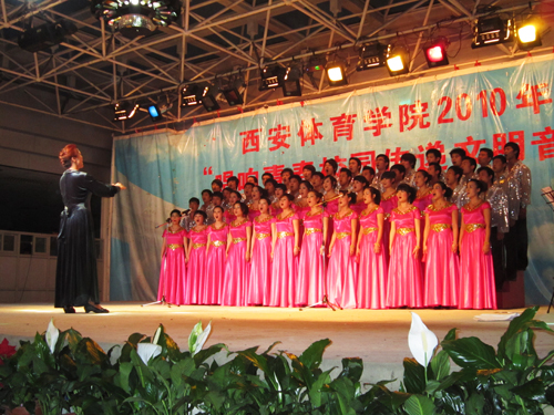 5月26日晚,由院团委、院学生会主办的西安体育学院2010年“唱响青春校园、传递文明音符”合唱比赛在大学生活动中心隆重举行。本次比赛共有八支参赛队伍,他们用歌声表达了“唱响青春校园、传递文明音符”的心声。我院相关职能部门及各系、部领导出席本次比赛并为获奖队伍颁奖。本次比赛还特别邀请了西安音乐学院等兄弟院校的专业老师担任评委。