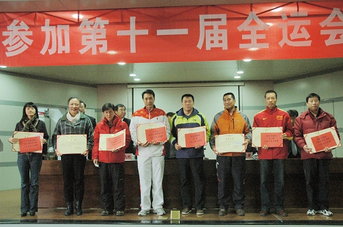 苏明理院长在讲话中代表学院党政向在全运会决赛中取得优异成绩的我院运动员、教练员表示热烈祝贺。他指出,我院在本届全运会取得的良好成绩主要得益于扎实的思想政治工作、扎实的工作作风、扎实的业务水平和扎实的责任意识。“成绩已载入史册,未来还须拼搏,”苏院长强调,在新的备战周期,学院将坚持教学、训练、科研“三位一体”的办学模式,继续高度重视和支持竞技体育;巩固重点优势项目,发展潜优势项目,支持非奥项目;坚持训练和运动队管理模式创新;坚持体育科研为运动训练实战服务。苏院长就今后竞训工作提出四方面要求:一是制订学院竞赛训练规划,建立长效机制,保持竞技体育的可持续发展;二是坚持“科学技术是第一生产力”的指导思想,充分发挥体育科技对运动训练的先导和保障作用;三是坚持训练创新;四是坚持管理模式创新。苏院长最后号召在座师生努力进取,再接再厉,力争在伦敦奥运会和十二运会上取得更加优异的成绩。