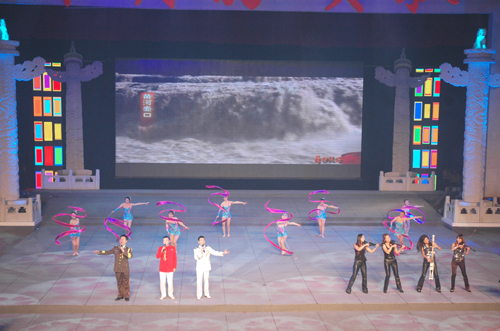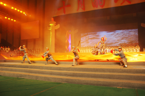 弹指挥间,光辉岁月60年。9月29日晚8点,我省庆祝新中国成立60周年大型主题文艺晚会《十月的颂歌》在西安交大思源活动中心盛大上演。晚会由曙光篇、旭日篇、逐浪篇、奋进篇四大篇章浪潮般推进,以音乐、舞蹈、诗朗诵、戏剧等形式展现了新中国60年波澜壮阔的美丽画卷。