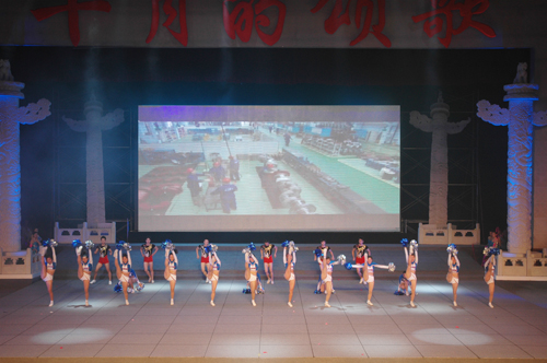 我院作为协办单位之一,主演了两套分别由艺术系、武术系精心编排的节目,为西体争得赞誉之声。在晚会开始不久的曙光篇中,我院六个生龙活虎的舞刀健儿(扮演英勇杀敌的八路军)在前台威武亮相,赢得阵阵喝彩声。晚会第四篇章奋进篇中,由我院艺术系主演的《年轻的朋友来相会·西部放歌》主题串烧节目一上演,即将整个晚会的气氛推向高潮。健儿们以啦啦操、健美操、艺术体操等体育与艺术相结合的形式调动了所有人的活力与激情,赢得在场观众空前热烈的掌声与欢呼。在该节目中,表演者们的靓丽身影既展示了三秦大地朝气蓬勃成长着的新一代风貌,也代表着新中国的青春活力与蒸蒸日上。晚会最后在全场高歌《歌唱祖国》的热烈气氛中落下帷幕。