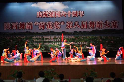 陕西舞蹈“荷花奖”第八届舞蹈比赛专业组于2009年7月13日至14日在西安建筑科技大学华清学院隆重举行。本次比赛有来自全省的各专业院团、艺术院校、少年宫和各社会舞蹈培训机构54个单位、近200个舞蹈作品参加,参赛选手近2000人,是我省近年来最大的一次舞蹈比赛交流活动。我院艺术系选出7支舞蹈参加本次比赛。经过激烈角逐,群舞《红珊瑚》、《城市病人》获得专业群舞B组二等奖;三人舞《冰山上的军礼》、双人舞《回家》、独舞《孔已己》获得专业青年B组独、双、三组二等奖;独舞《风吟》、《雪中梅》获得优秀奖;西安体育学院获“优秀组织奖”。