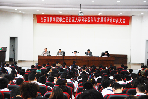 大会最后,学院学习实践活动领导小组学生工作组组长侯伟同志对《西安体育学院学生党员开展深入学习实践科学发展观活动实施方案》从指导思想、目标要求、基本原则、学习实践活动形式、各阶段工作进行了详细的安排。
