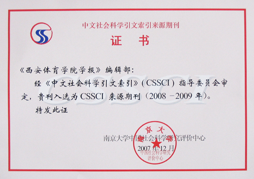 2008年,在学院的大力支持、编辑部全体编辑的努力下,《西安体育学院学报》入选2008-2009年“中文社会科学引文索引(CSSCI)”来源期刊。这是本刊继入选“中文体育类核心期刊(北京大学)”和“中国人文社会科学核心期刊(中国社会科学院)”后的又一殊荣。至此,《西安体育学院学报》已经进入国内与体育相关的全部三家权威数据库。