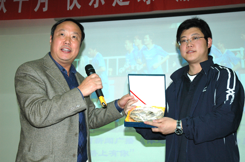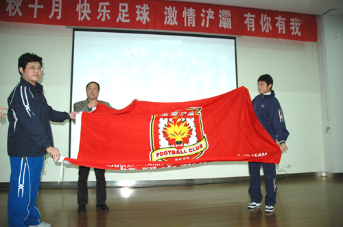 首先,我院党委书记董小龙致辞,欢迎中新浐灞足球队走进我院。院长苏明理代表学院将特有的纪念牌赠予浐灞足球队,以及一套我院50年校庆制作的精美校徽送给每位球员。随后,陕西宝荣足球俱乐部总经理助理殷建新将全队队员签名的足球和浐灞足球队的狼旗作为礼物回赠我院。