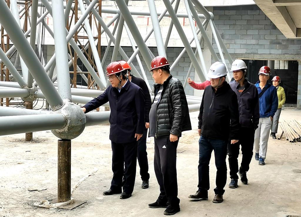 在新校区建设现场,黄道峻在基建处、施工单位、监理单位负责人陪同下,视察了十四运“一馆四场”建设情况,并与基建处全体工作人员进行了座谈调研。