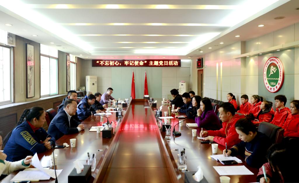 本网讯 近日,为进一步贯彻落实“不忘初心、牢记使命”主题教育要求,弘扬爱国奋斗精神,党委宣传部党支部与竞技体校党总支邀请到我校优秀毕业生、庆祝新中国成立70周年阅兵仪式三军仪仗队排头兵刘启明,举行“不忘初心、牢记使命”主题党日座谈会。党委宣传部全体党员干部,竞技体校党员干部、蹦床队教练员运动员参加会议。竞技体校党总支书记樊康主持座谈会。