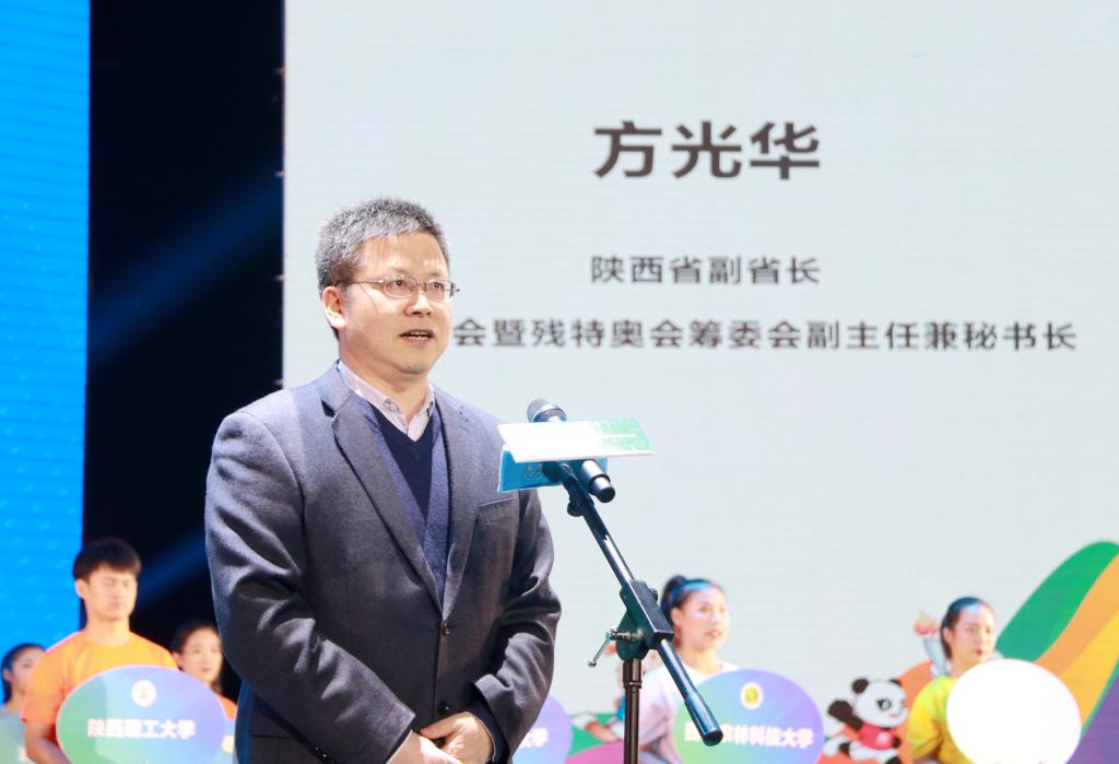陕西省副省长、十四运会陕西省筹委会副主任兼秘书长方光华出席并宣布开赛,省体育局局长、十四运会暨残特奥会筹委会副秘书长王勇致辞,省政府副秘书长、十四运会暨残特奥会筹委会副秘书长高阳主持了开赛仪式。陕西省教育厅副厅长赵昶葆,共青团陕西省委副书记、十四运会暨残特奥会筹委会志愿服务部驻会副部长鲁镇,我校党委书记黄道峻、校长朱元利出席。