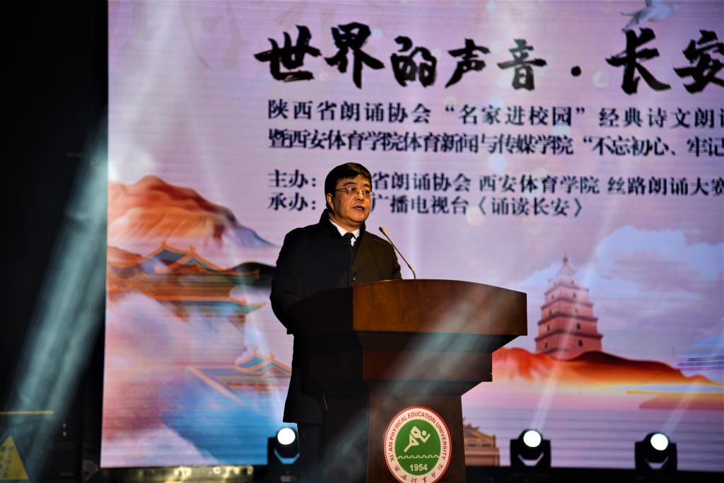 本网讯 进一步贯彻落实“不忘初心、牢记使命”主题教育要求,以诗言志,用先进文化引导人、用传统经典教育人、用高雅艺术熏陶人、用优秀作品鼓舞人,11月27日下午,由陕西省朗诵协会、西安体育学院主办的“名家进校园”经典诗文朗诵会在我校综合艺术馆隆重举行。来自陕西省的著名播音朗诵表演艺术家们汇聚一堂,深入学校与我校青年学子同台表演,近距离交流,为我校师生奉上了一场高雅的有声语言艺术盛宴。校党委书记黄道峻,党委副书记刘子实,副校长文立新、刘新民,纪委书记赵军出席了本次活动。