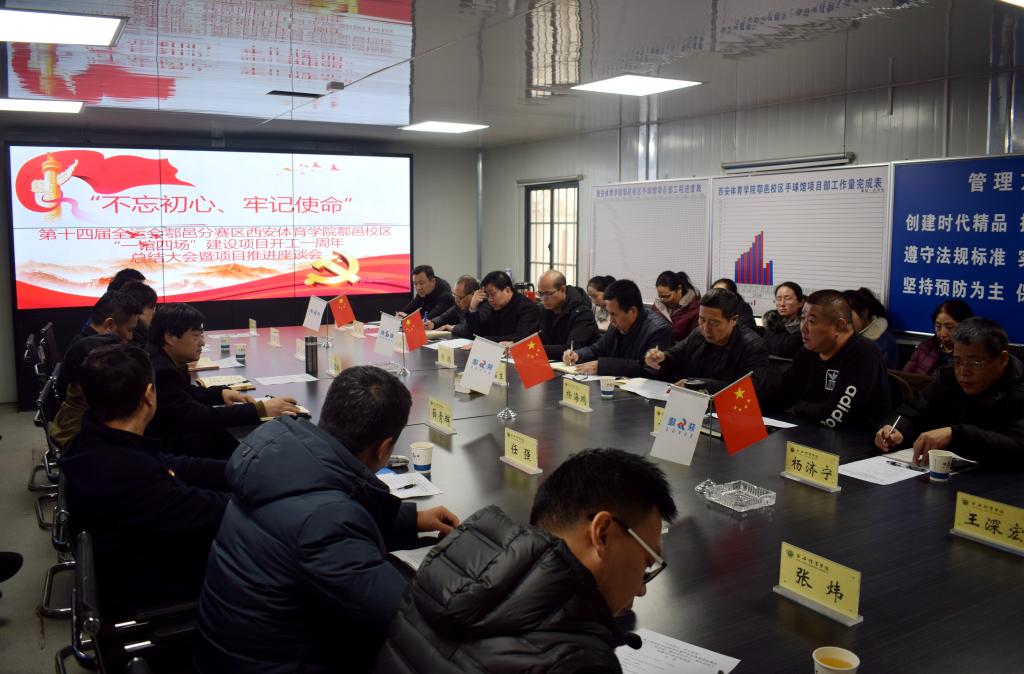 本网讯 为深入贯彻落实校党委“不忘初心、牢记使命”主题教育,凝心聚力完成省委、省政府、十四运筹委会交付我校“一馆四场”项目建设的目标任务,近日,基建处“不忘初心、牢记使命”主题教育暨新校区建设工作座谈会、新校区建设第八次专班会在鄠邑新校区建设现场一并召开。副校长李富生,省发改委社会处正处级调研员、十四运筹委会场馆建设部综合处处长杨海鹏,省体育局场馆处副处长刘进,施工单位、监理单位、设计单位负责人及基建处相关人员参加座谈会。基建处处长甘泽军主持会议。