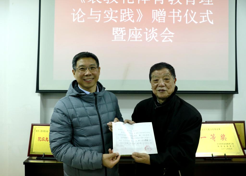 座谈会结束后,王增明教授向图书馆、离退休工作处赠送了《袁敦礼体育教育理论与实践》。