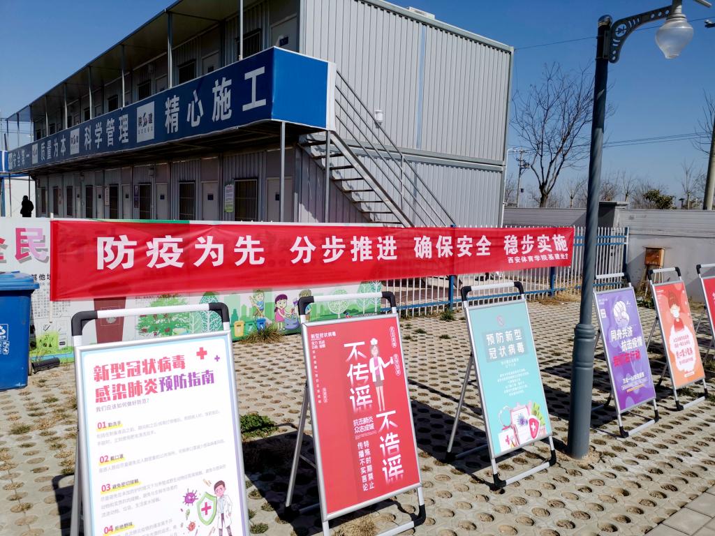 本网讯 为贯彻落实省委、省政府、十四运筹委会与省体育局关于有序推进复工复产的意见精神,经过近半个月的努力,在校党政领导的统筹安排下,我校完成了鄠邑新校区“一馆四场”建设项目复工人员筛查、建档立卡、制定防控方案、防疫设备和材料的准备、隔离区分割、防疫宣传教育以及复工计划的制定。
