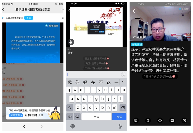 形式新颖,效果良好。开课第一天,我校辅导员全部跟班进群,各班班长开课前20分钟发信息督促同学做好上课准备;对于崭新的教学形式,同学们充满了新鲜感和好奇心,在课前积极预习上课内容,课中积极与老师互动配合,在老师讲解过程中发现没听明白的地方,同学们主动提问,当老师讲到精彩部分时,同学们纷纷送上小花给予支持。