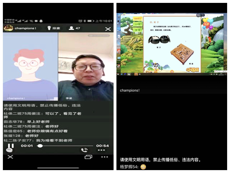 武术学院于善老师(左)与运动训练学院谢宜轩老师(右)通过腾讯会议直播与慕课堂开展教学