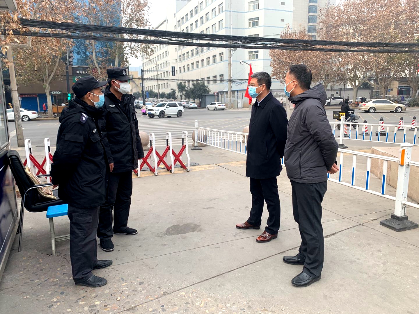 副校长文立新(右二)与保卫处处长雷振华(右一)检查校门口疫情防控工作