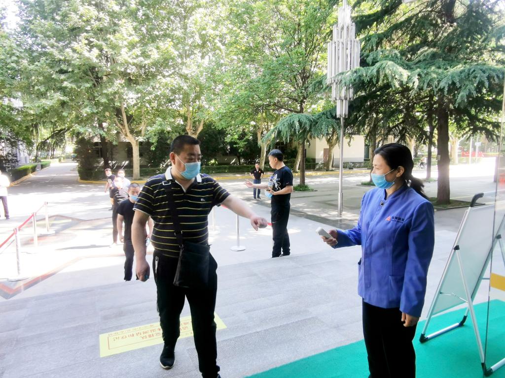 演练人员保持1.5米间距并进行体温检测后进入餐厅