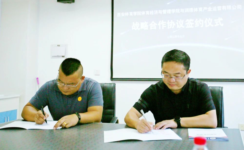 随后,杨涛和戴立敢代表双方签署战略合作协议。此次签约,标志着体育经济与管理学院和润德体育未来将在人才培训、实训实习、教研授课、研发、技术交流、市场开发、赛事运营、场馆运营、体育经济、国际交流等方面展开全方位合作,实现资源共享,强强联合,助推体育产业发展。