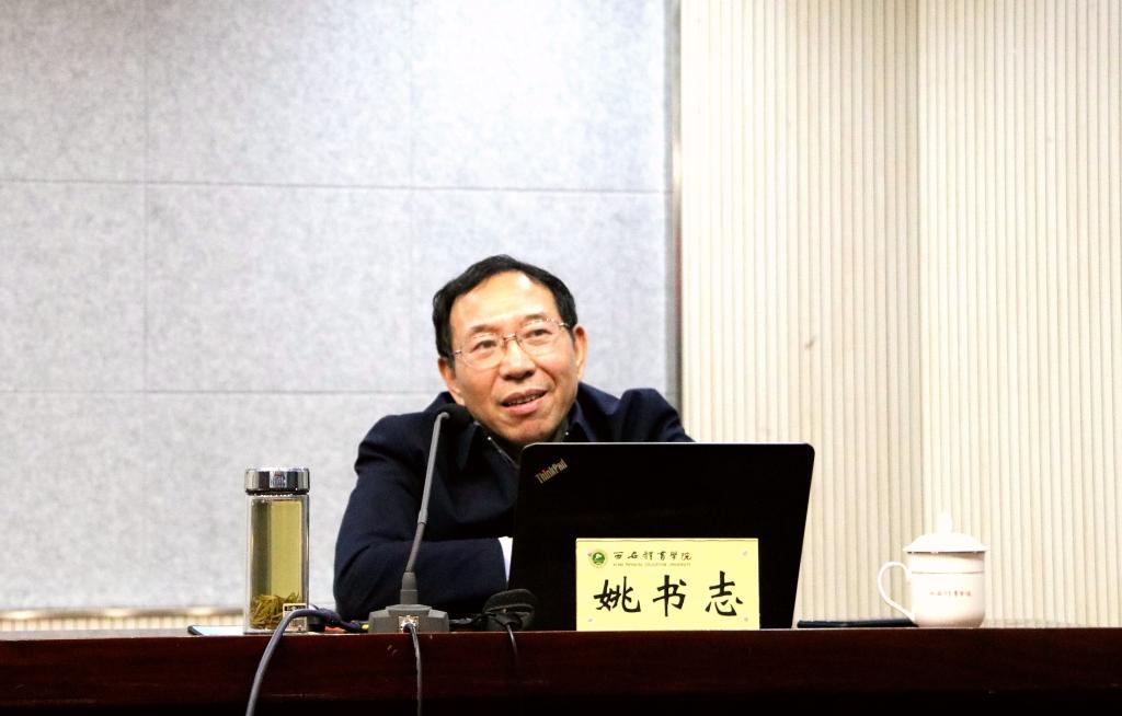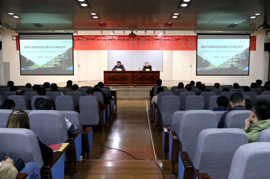 本网讯 10月21日下午,我校2020年干部教育培训第二讲在教学楼一楼报告厅举行,陕西科技大学党委书记姚书志同志作“新时代西部特色院校建设与发展的思考——陕西科技大学人才强校战略引领追赶超越的实践与探索”专题讲座。校长朱元利主持,全校处科级干部及党支部书记参加。