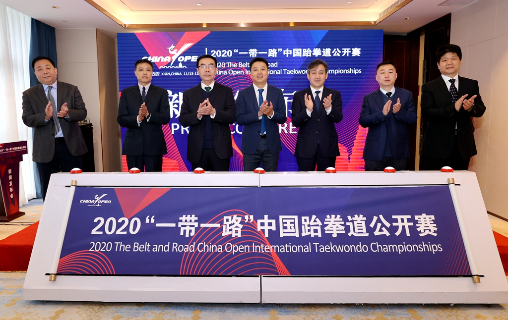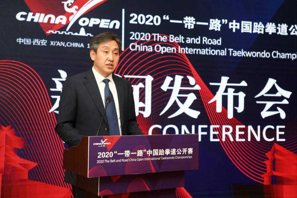 本网讯 11月5日上午,2020“一带一路”中国跆拳道公开赛新闻发布会在西安举行。中国跆拳道协会副主席王刚、陕西省体育局副局长张王平、我校校长朱元利、陕西省体育局体育经济处处长李佳蔚、陕西省拳击跆拳道运动管理中心党支部书记张文军、西安市体育局副局长徐岗、西安经开区管委会副主任刘明利等领导嘉宾出席发布会。