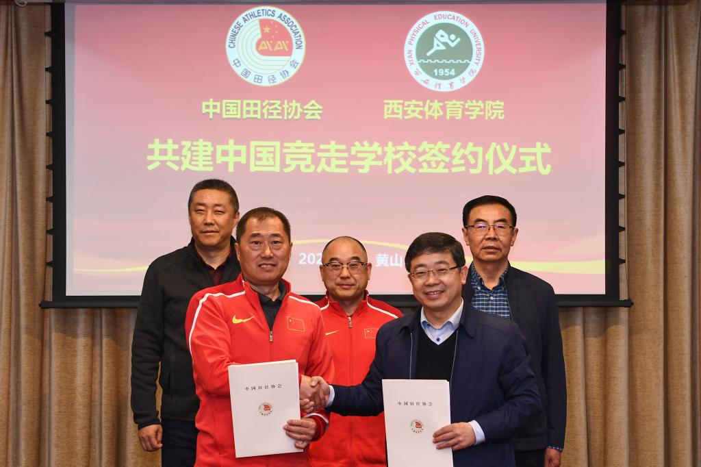 本网讯 3月19日,我校与中国田径协会在黄山签署合作协议,继续共建中国竞走学校,以期充分借助举国体制创新促进竞走项目进一步发展,为国家队不断培养高水平竞走人才。中国田径协会副主席兼秘书长于洪臣、中国田径协会副主席田晓君、陕西省体育局副局长邹军、我校校长刘子实、原校长朱元利等出席签约仪式。