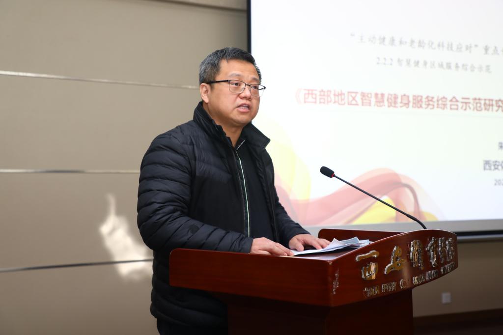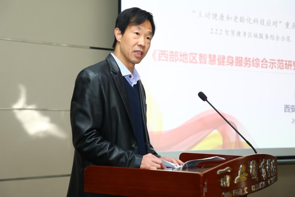 我校朱元利教授作为项目负责人从项目背景、项目意义、研究总体思路、技术架构、研发团队、任务分解等方面介绍了项目的基本情况。他谈到,该项目紧紧围绕《“健康中国 2030”规划纲要》 和“互联网+”国家战略主题,抓住陕西省承办十四运会和残特奥会重要契机,依托场馆信息化和场馆基础设施等建设成果,研究并系统集成西部地区智慧健身服务综合平台,实现现代信息技术手段与全民健身的创新融合,与国家全民健身信息服务平台对接,凸显西部特色、助力全民健康,探索主动健康的中国方案,实现“科技赋能群众体育”的目标。该项目的实施一方面将加强场馆开放服务与信息监管、提高场馆与体育设施的利用率,解决好老百姓“在哪健身”的问题;另一方面将结合人民群众的不同需求,提供个性化健身指导服务,解决不同人群 “如何科学健身”的问题。项目旨在建成西部地区智慧健身服务综合平台,进一步完善西部地区全民健身公共服务体系;应对“我国步入老龄化社会,总卫生支出费用逐年递增”的困境,逐步改变“生活方式疾病致死率逐渐上升”的趋势,助力“健康中国,全民健康”目标的实现,全面提升地方政府服务全民健身的综合能力。