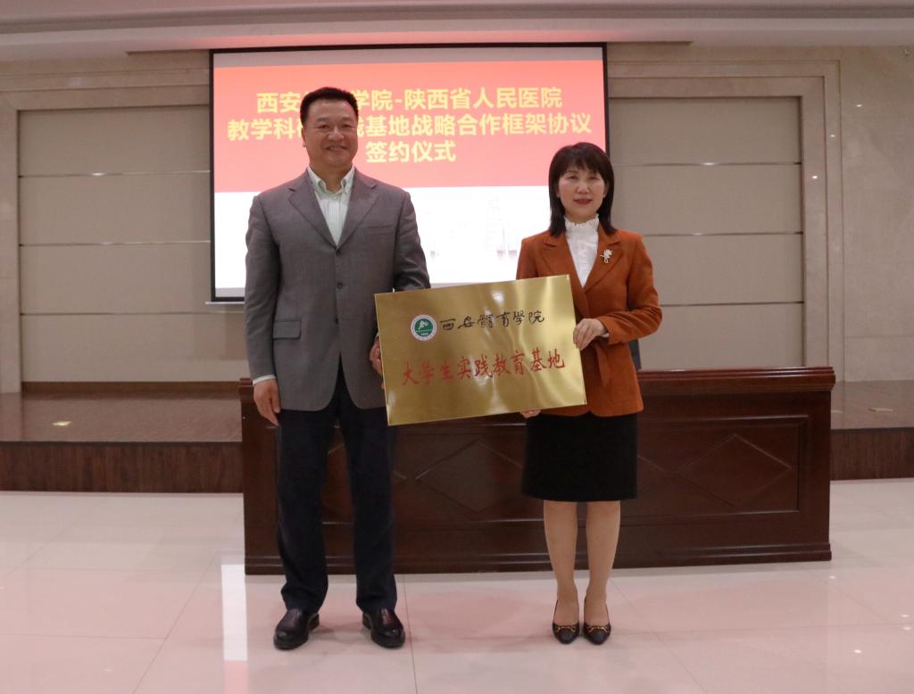 随后省人民医院康复医学科、我校运动与健康科学学院分别介绍了各自发展情况。刘子实与宋张骏签订了项目合作协议书,陈彦代表学校向陕西省人民医院授“大学生实践教学基地”牌匾。会议结束后宋张骏一行参观了我校运动与健康科学学院实验室。