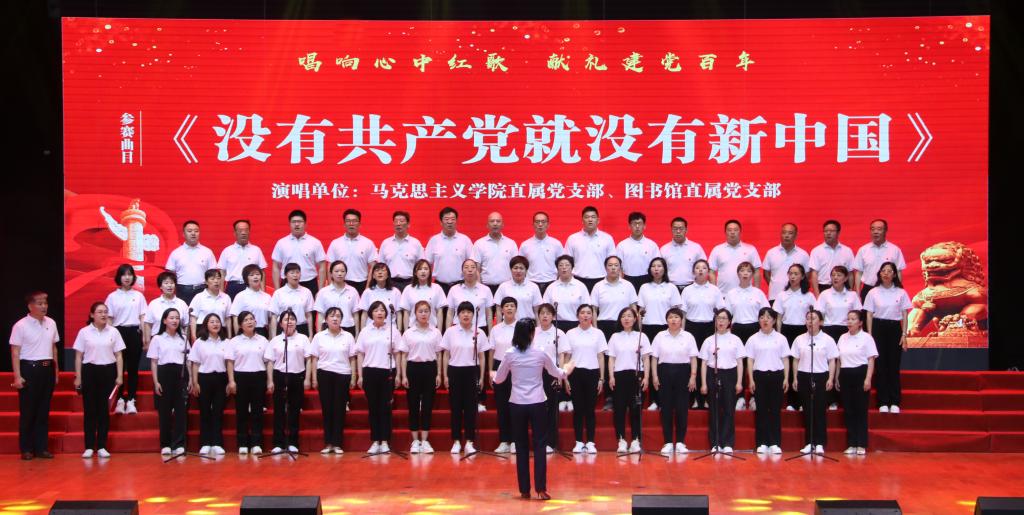 马克思主义学院和图书馆直属党支部合唱团深情演唱《没有共产党就没有新中国》,唱诵了那个水深火热的年代里伟大的抗战故事。