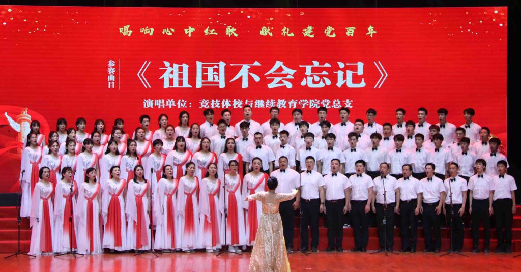 竞技体校与继续教育学院党总支合唱团演唱的《祖国不会忘记》,歌颂战场上抛头颅、洒热血的战士们。